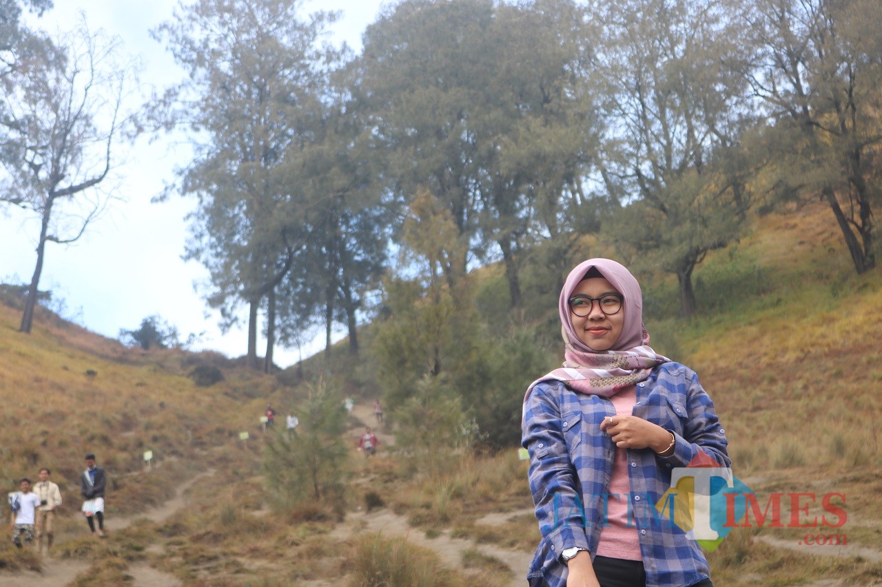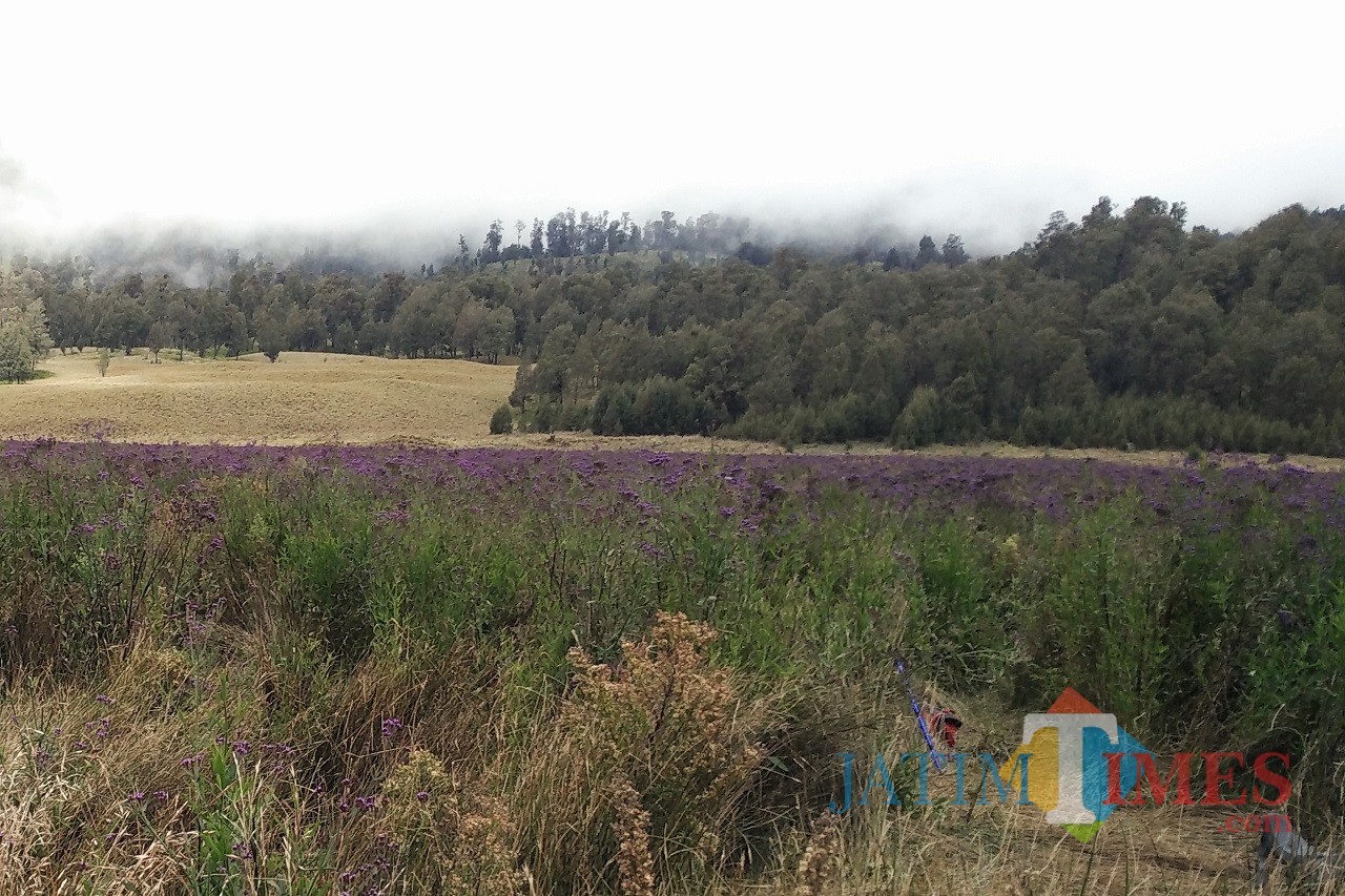 “Setelah Tanjakan Cinta, ada savana Oro Oro Ombo, jika melihat arah kiri yaitu arah Ungup-Ungup juga ada savanna. Di sini kita disuguhi pemandangan bunga verbena dengan mahkota berwarna ungu,” terang Kepala Resort Ranupani tersebut.