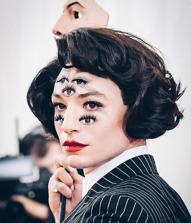 Bagaimana tidak ia tampil dengan dandanan yang super nyentrik karena di wajahnya sudah ada tujuh mata ilusi yang menempel.