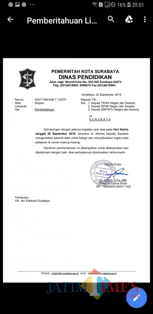 Sebuah surat dengan kop Dinas Pendidikan Kota Surabaya beredar secara viral di lini masa. Surat tersebut pemberitahuan tentang libur sekolah pada tanggal 26 September. Surat dengan nomor 420/11482/436.7.1/2019.