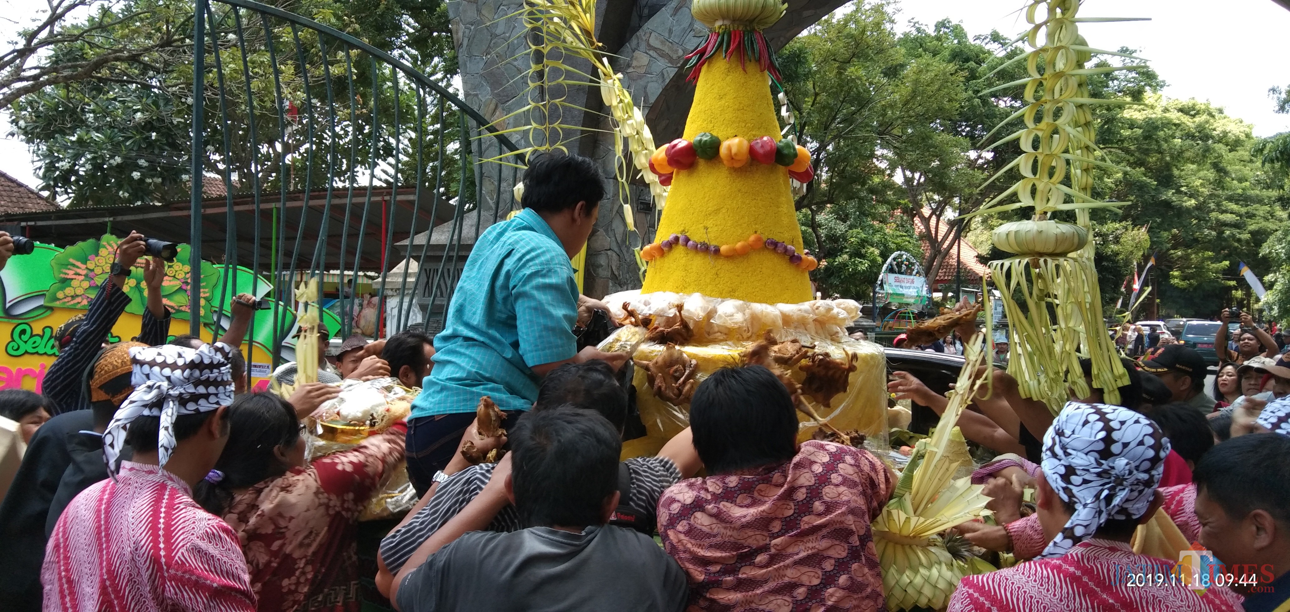warga yang menunggu sejak pagi berebut isi buceng dan tumpeng (foto : Joko Pramono/Jatim Times)